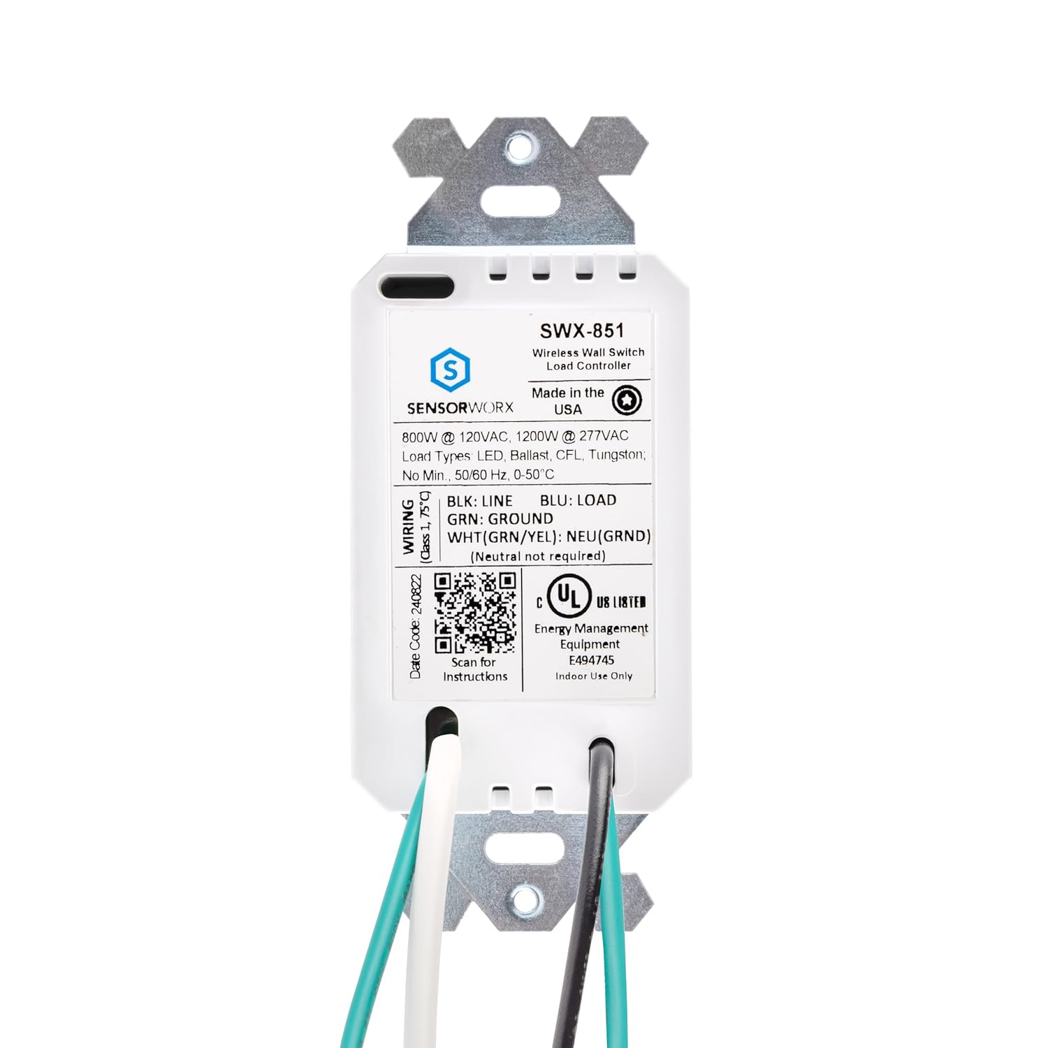 The SENSORWORX wireless wall switch load controller links to remote occupancy sensors, photocells, and switches without low voltage wiring in order to provide automatic lighting control. Designed with contractors in mind, the unit is significantly shallower than typical wall controllers, resulting in less crowded wall boxes. Additionally, versatile wiring enables usage with or without a neutral connection and never requires a minimum load. This switch also matches the SENSORWORX family of wall switch occupancy sensors and 0-10V dimming wall switch sensors. All SENSORWORX products are proudly made in the USA.