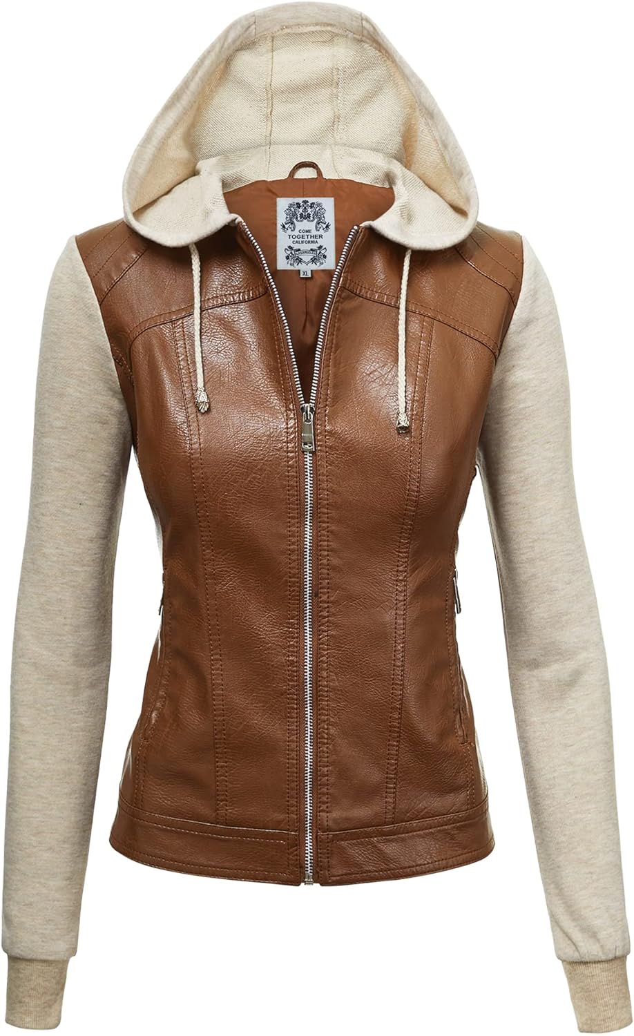 A 2-for-one motorcycle jacket. Faux leather jacket featuring a removal knit hood and front panel with exposed zipper. Pintucks details on shoulder, waist and sleeve. Double snap collar. Metal exposed front zipper placket and pockets. Fully Lined. Medium weight.