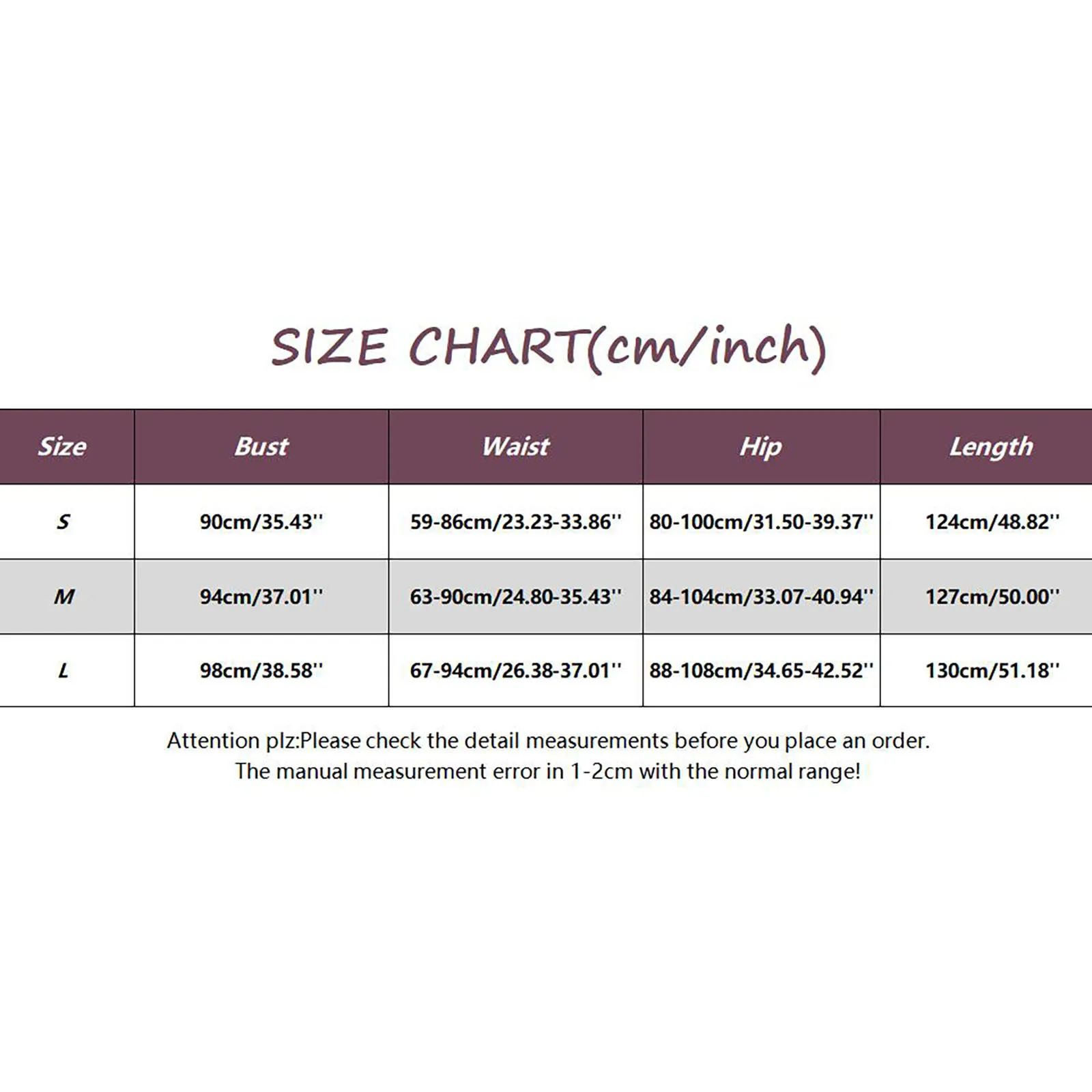 | Size:M | Bust:94cm/37.01'' | Waist:63-90cm/24.80-35.43'' | Hip:84-104cm/33.07-40.94'' | Length:127cm/50.00'' |