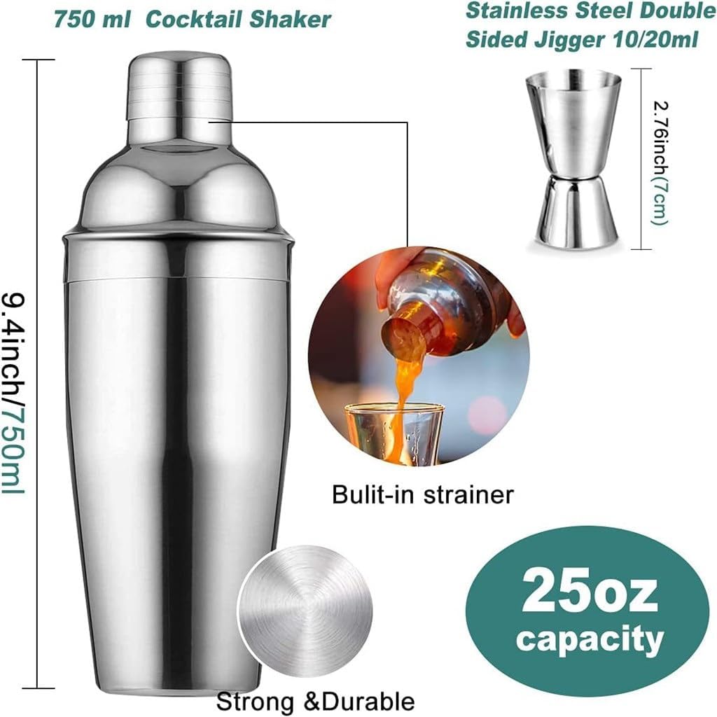 Strong and .Easy to store.Entertaining your guests at home or at a party is a great option.This is a great gift for cocktail lovers at weddings, birthdays, Thanksgiving, Christmas, or business events.This bartending tool can be recommended to beginners, experienced bartenders, your family, your friends, etc.Specifications: Material: Stainless steelOccasion: Gift bar, bar, family party, etcPackage Included:1pc 750ml Shaker pot1pc 15/30ml measuring cup1pc bottle opener1pc ice clamp1pc 28cm mixing stick1pc Seahorse bottle opener1pc crushed Popsicle1pc ice filter2pcs wine dispenser3 Scotchs stainless steel ice cubes2pcs wine stopper1pc cheese 1pc wine display standNotes: 1. Only sell main products, not other products.2. Due to screen differences, the color may be slightly different from your expected color, please allow.Remind:After receiving the packaging, please check the packaging and the product carefully. If the received item is defective or has any questions, please us via email to resolve the problem. We will reply as soon as possible and do our best to meet your needs.Ideal Gift for Cocktail Lovers: With the elegant packaging, this bar set is an Ideal gift for cocktail lovers for wedding, birthday, housewarming, Thanksgiving, Christmas, Valentine or business. This bartending kit is recommended for beginner, experienced bartender, your lover, your family, your friends.