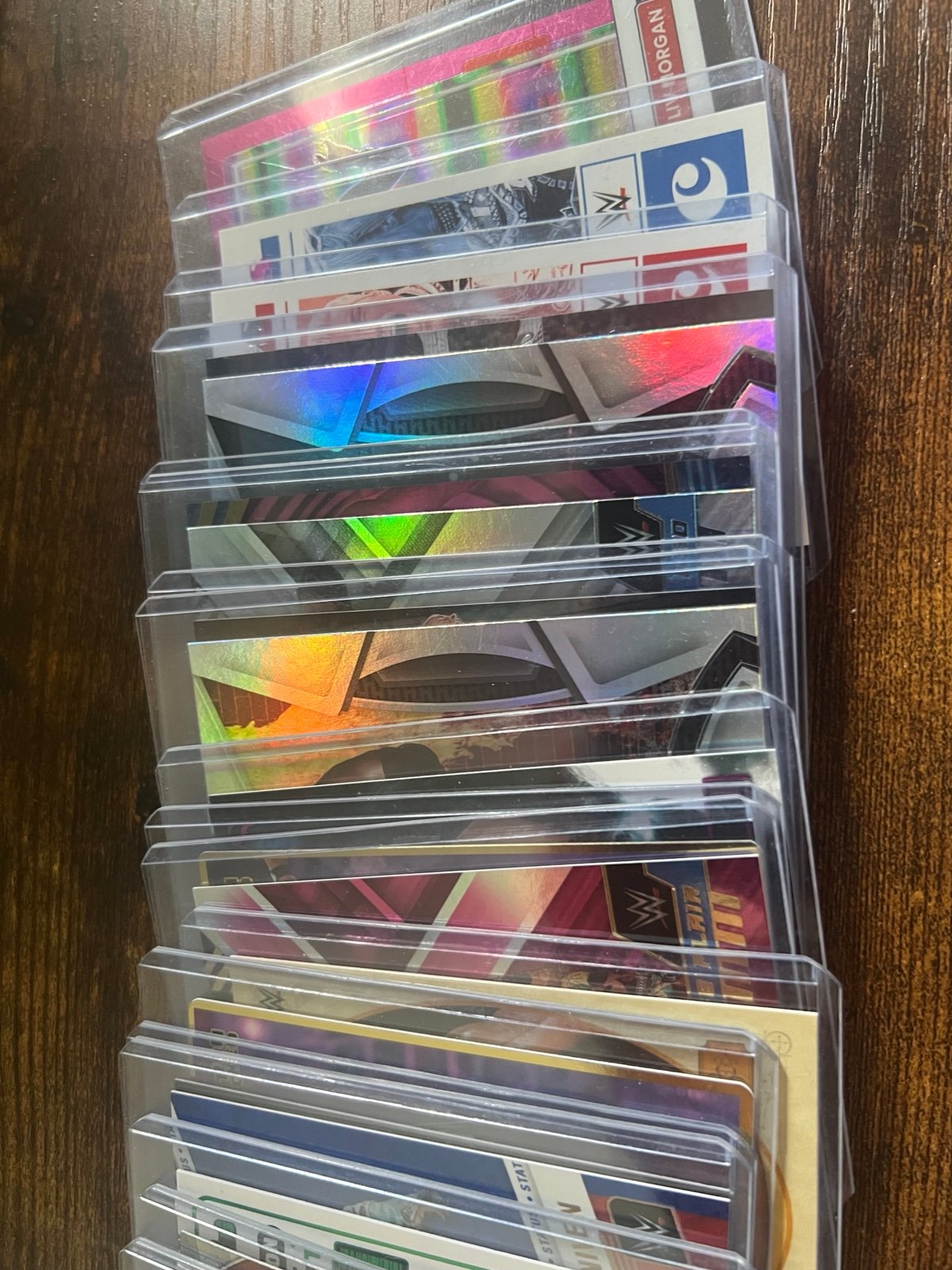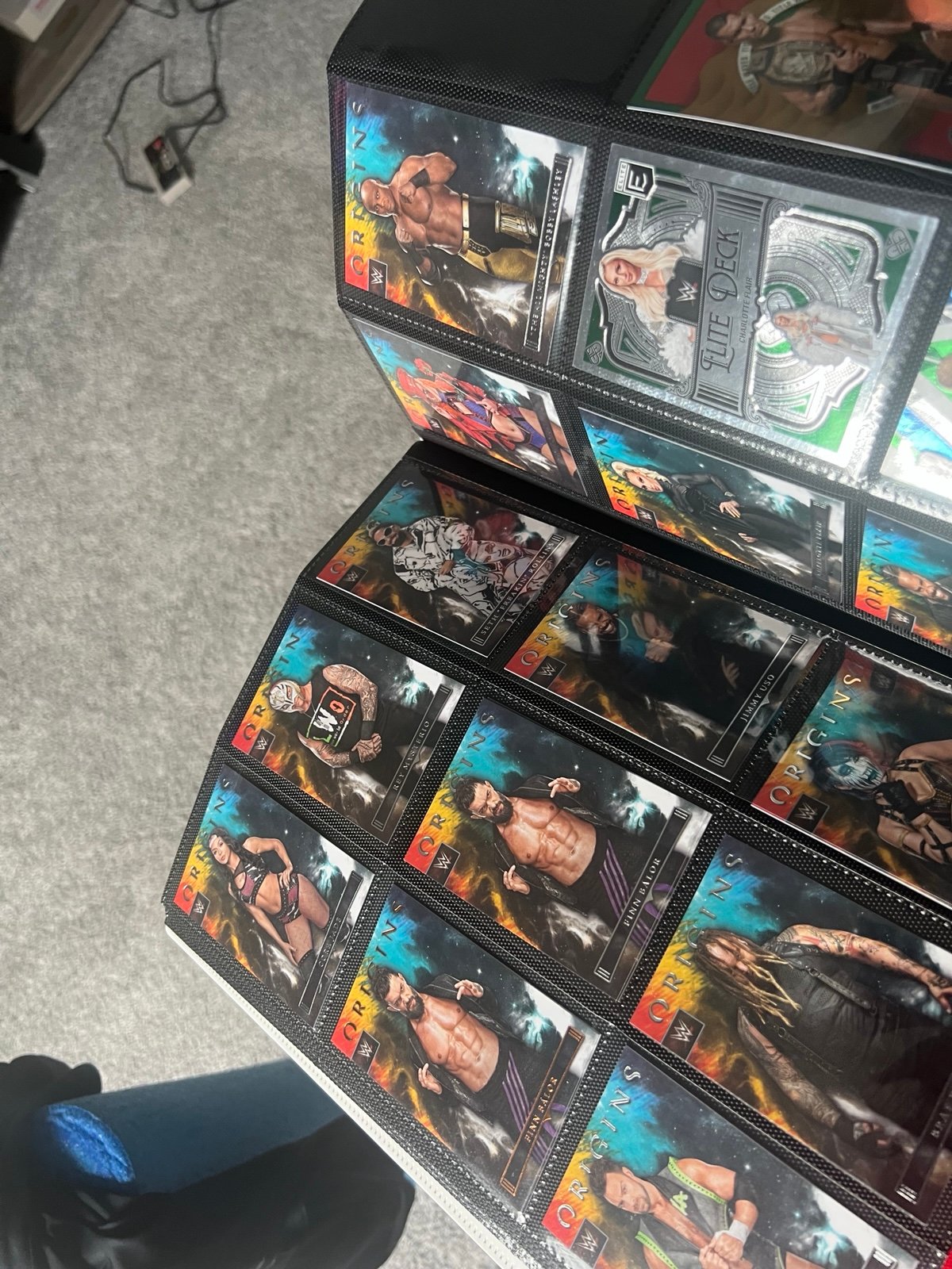 WWE Panini sports card Chronicles as well as many others mixed in. From 2023 to 2025 binder full of cards as well. Whole number cards are in the hard plastic protector sleeves. We basically took them out of the packages and put them right in the binder and hard protectors sleeves. Still plenty of room in the binder, all cards are in perfect condition.