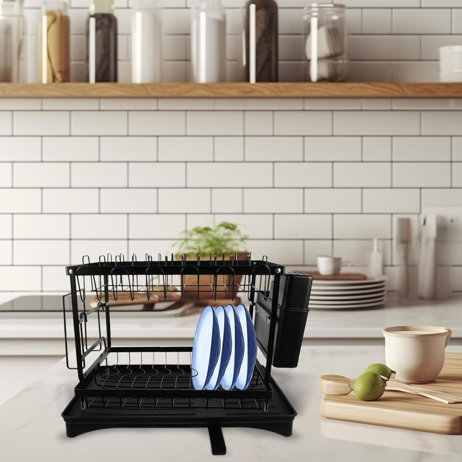 Package Include 1 x storage rack 1 x cutting board holder 1 x chopsticks pot Features -Size:42.00X29.00X29.00cm/16.51X11.40X11.40in -Material:Carbon steel, plastic -Product Info:Drain storage rack -Color:Black - A countertop draining rack allows you to efficiently dry your dishes, mugs, pots and pans. drying rack dishes - You can organize your bowls and plates, tableware and keep the kitchen countertop tidy. compact dish drying rack - Suitable storage dish diameter 13-30cm/5.12-11.81in, dish height 1-3.5cm/3.93-1.38in, bowl dish diameter 7-12.8cm/2.76-5.04in, bowl height 3.5-5.5cm/1.38-2.17in kitchen storage rack. - This tableware draining racks very easy and simple to operate, giving you great convenience dishes drying rack. - Store the dishes, cups, and cutlery after washing, a practical accessory for your kitchen and bring you convenience kitchen multifunctional storage rack. - The material is safe and light, which is wear resistance and practical for the lasting time use.Goods Descriptionmulti functional kitchen storage rack Proper size, the draining rack for dish is easy to clean and store, it will not take up much more space.kitchen drying rack If you are a small kitchen who does not want to empty the dishwasher too often, you can consider purchasing this dish drying rack