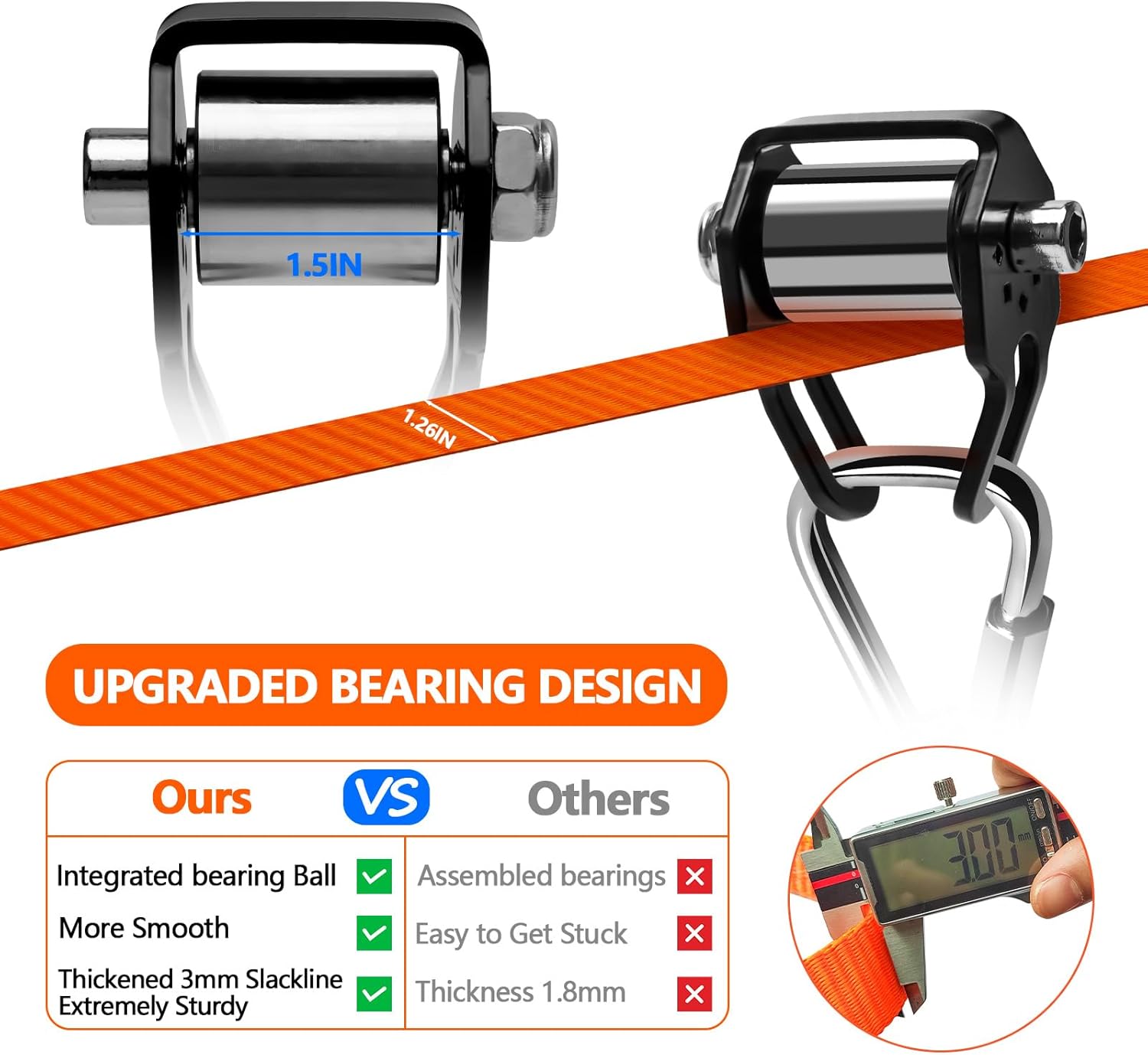 • 【Quick & Easy Setup – Ready in Minutes】No complicated tools required! Simply find two trees within 60 ft, wrap the tree protectors, attach the slackline and pulley, and you’re ready to ride. Clear instructions make installation fast and frustration-free for parents.